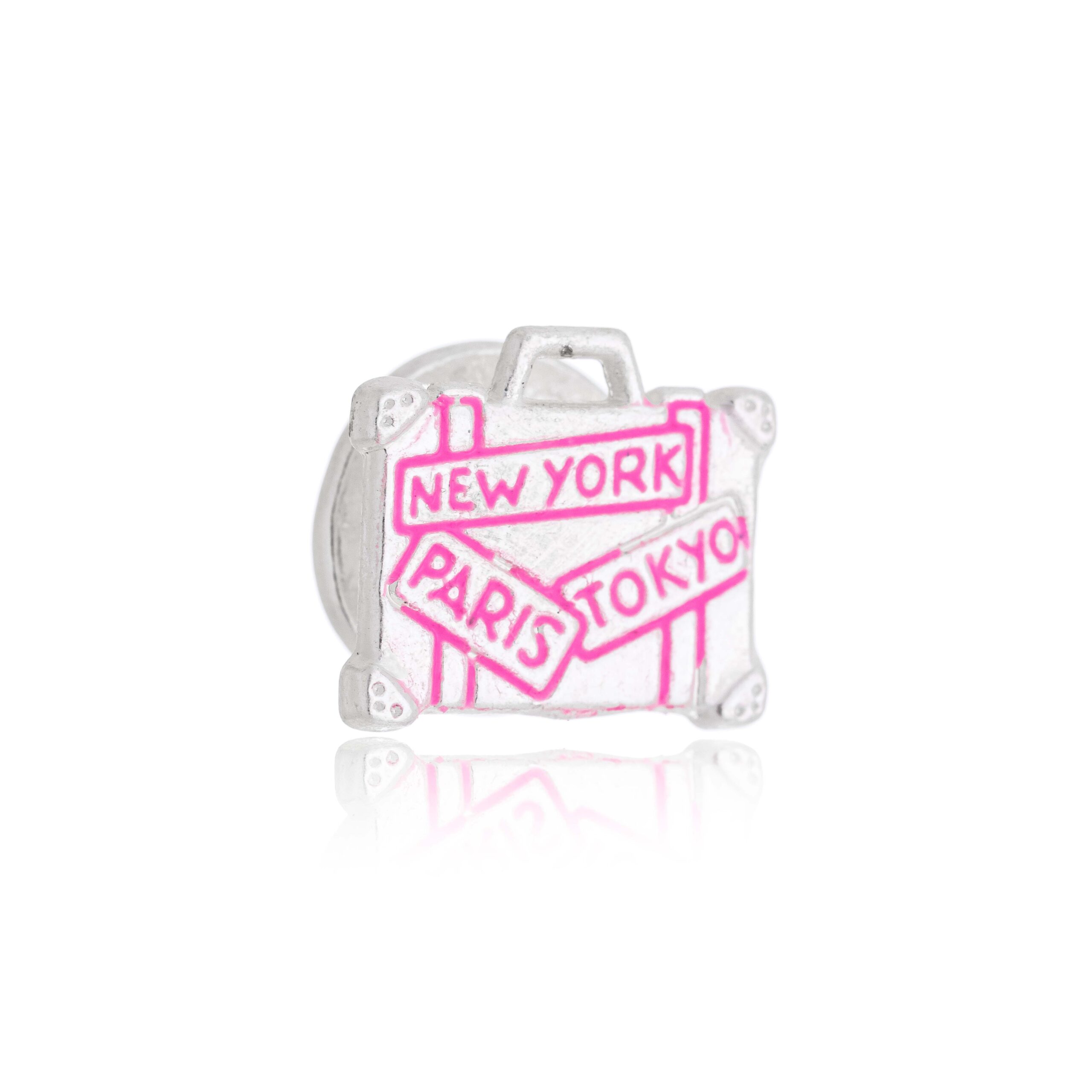 Pin modelo mala de viagem na cor prata com detalhes rosa